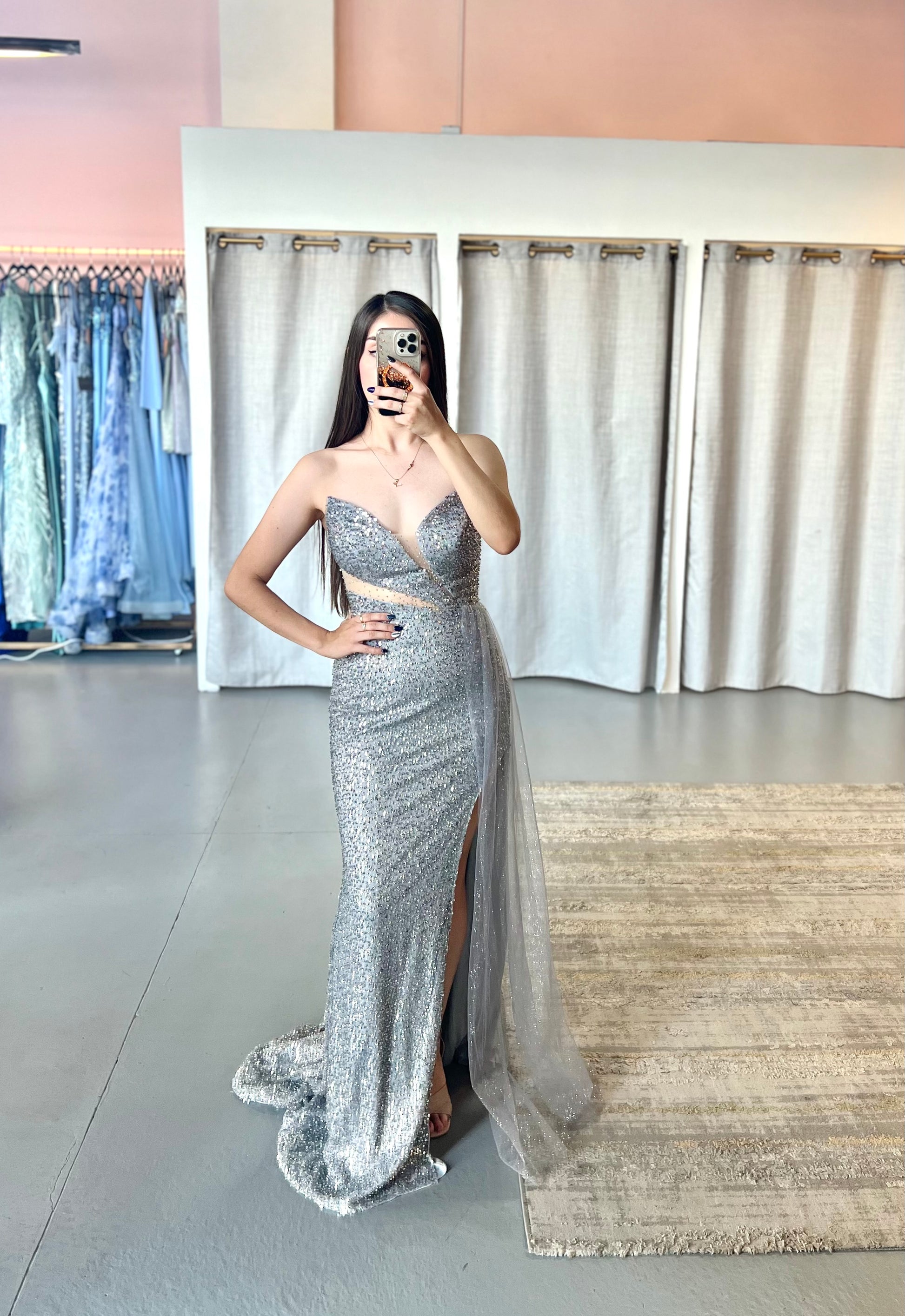 Strapless, full lentejuela, cauda lateral cuello picos