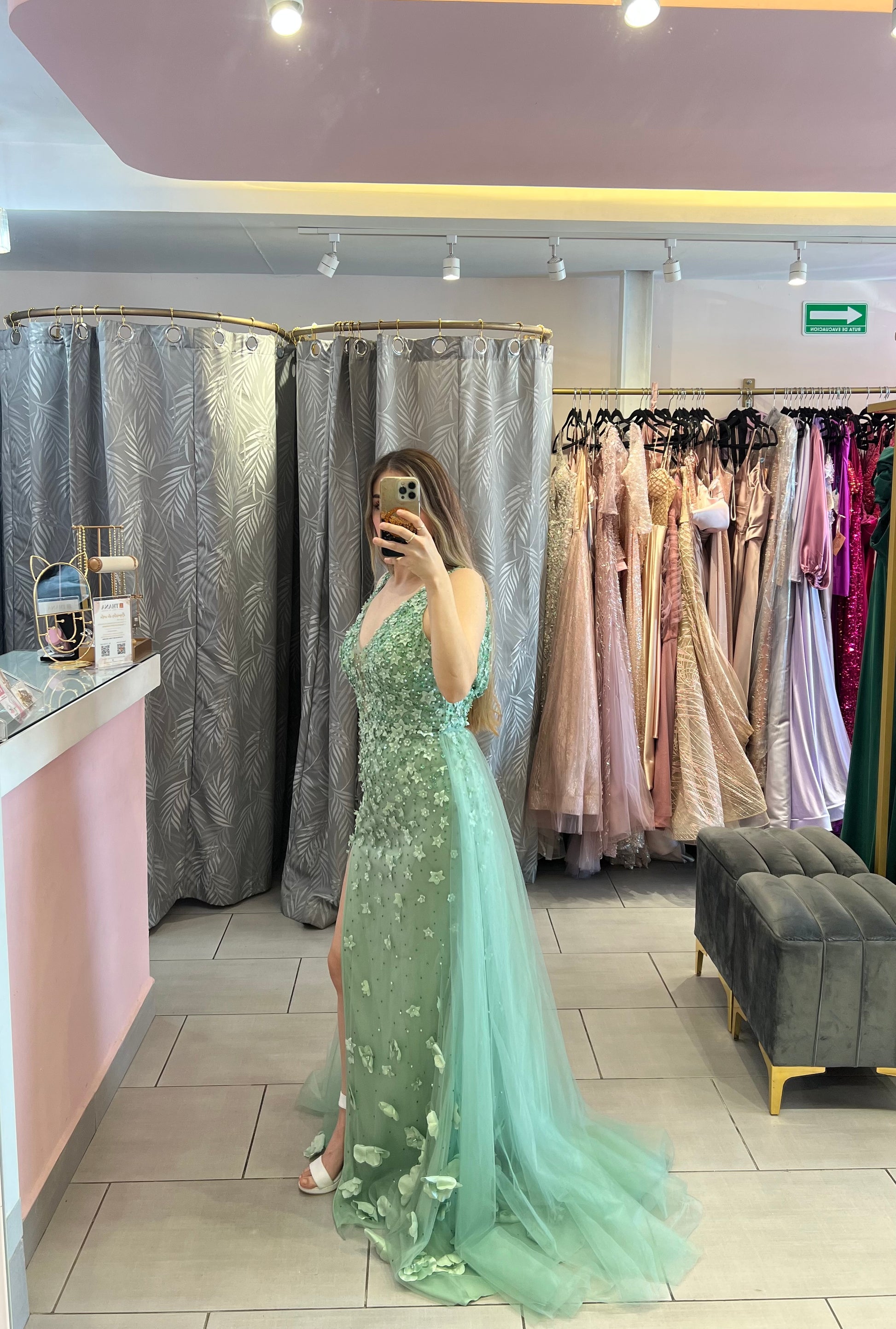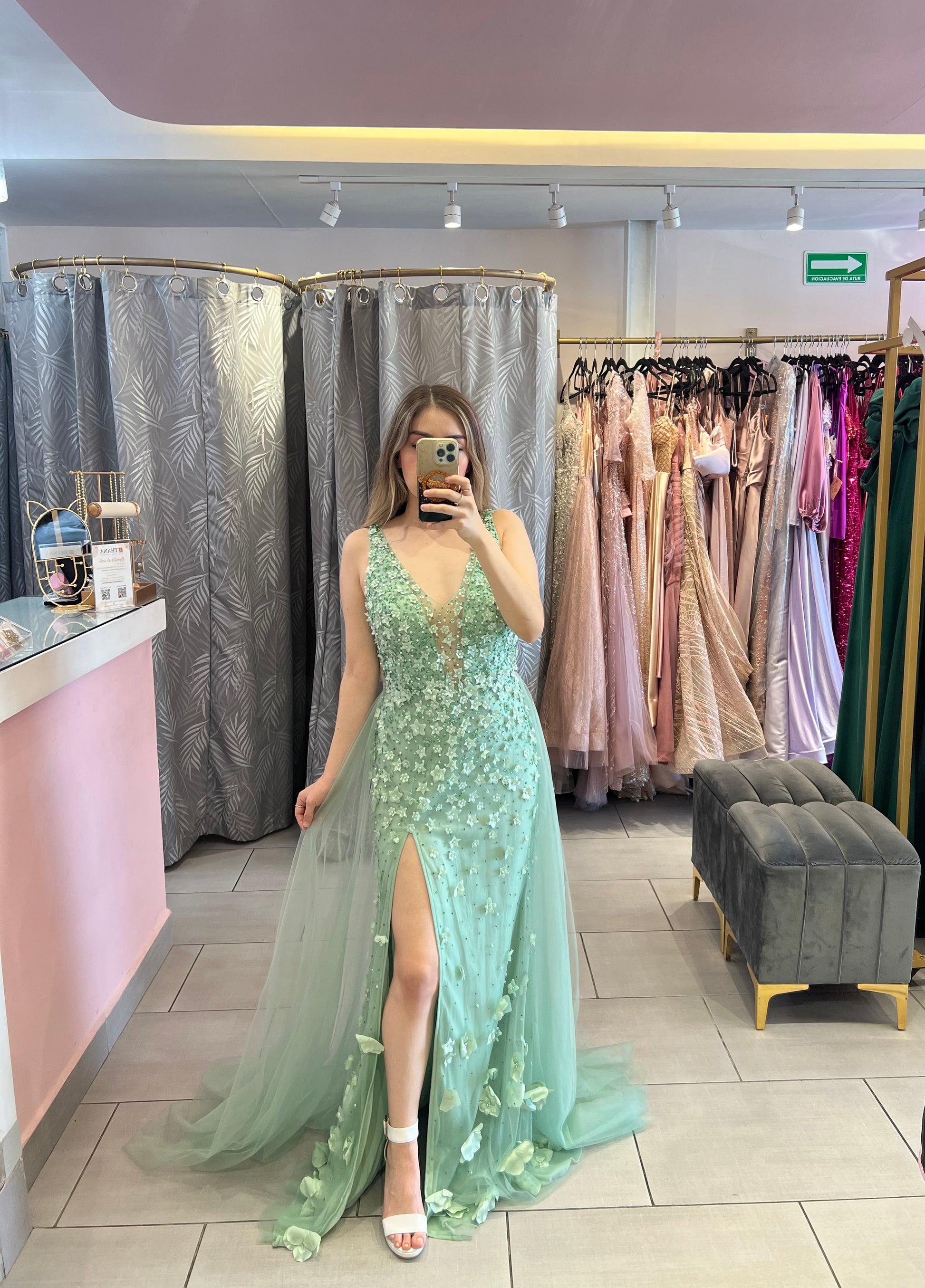 Flores 3D, piedras verdes, cauda trasera tul, abertura pierna